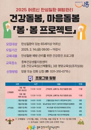 (정도일보) 시흥시 중부건강생활지원센터는 2월 24일부터 6월 26일까지 만성질환이 있는 65세 이상 어르신을 대상으로 건강증진 프로그램 ‘봄ㆍ봄 프로젝트’를 진행하며, 참가자를 모집한다.
