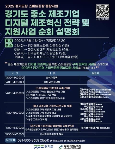 자세한 사항은 3월 4일부터 7일까지 열리는 사업 순회 설명회에서 확인할 수 있다. 또는 경기테크노파크 사업공고 게시판에서 추가 정보를 확인하거나 경기테크노파크 경기스마트제조혁신센터로 문의하면 된다.