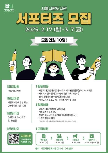 서포터즈 모집은 2월 17일부터 3월 7일까지 3주간 진행되며, 사람도서관에 관한 관심과 애정을 가진 20세 이상 시흥시민이라면 누구나 지원할 수 있다. 모집 인원은 총 10명이다.
