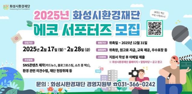 (정도일보) 화성시환경재단이 환경 보호와 지속 가능한 미래를 위해 활동할 ‘2025 에코 서포터즈’를 모집한다.