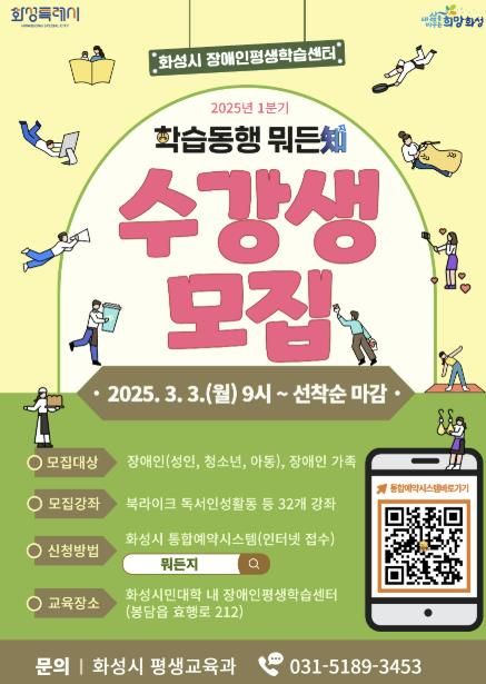 (정도일보) 화성특례시는 다음 달 3일부터 2025년 1분기 장애인 평생학습센터 프로그램 ‘학습동행 뭐든지’ 수강생을 선착순 모집한다.
