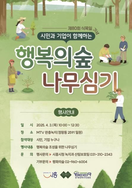 (정도일보) 시흥시는 제80회 식목일을 맞아 4월 3일 정왕동 시화MTV 완충녹지(정왕동 2591 일원)에서 ‘행복의숲 나무 심기 행사’를 개최함에 따라, 시민과 함께 푸른 도시를 조성할 수목을 기부하고 행사에 참여할 기업을 모집한다.