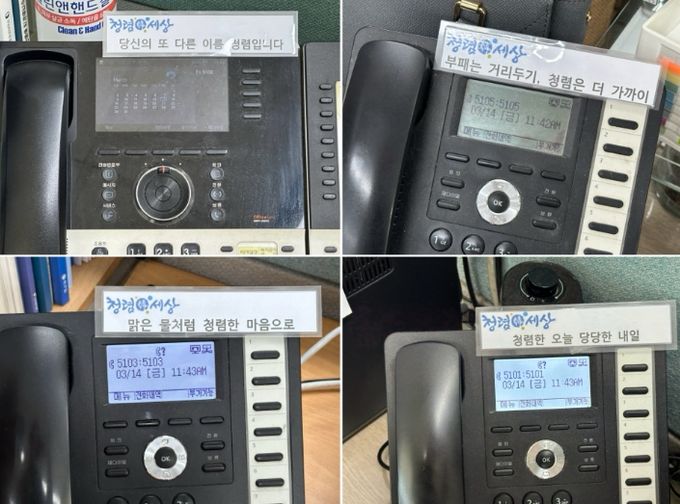 이날 행사에서 김태형 감사담당관을 비롯한 직원들은 각자가 청렴 실천을 다짐하는 문구를 작성하고 이를 부서원들과 공유하는 시간을 가졌다. 이어 직원들이 작성한 청렴 문구는 ‘청렴전화기'에 부착되어 직원들이 청렴 실천 의지를 다지는 계기가 됐다.