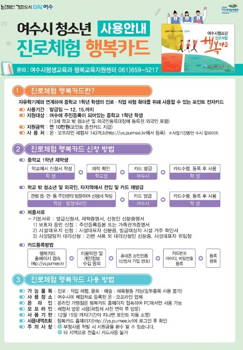 (정도일보) 여수시는 중학교 자유학기제와 연계해 청소년 진로체험 행복카드를 지원한다고 밝혔다.