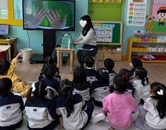 여수 은혜유치원에서 뷰박스를 활용해 어린이 손 씻기 교육을 진행했다.