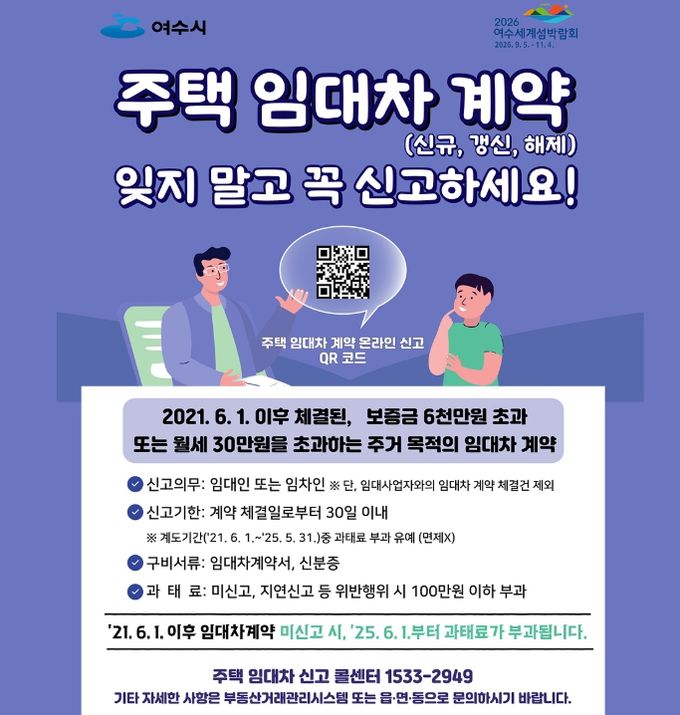 (정도일보) 여수시는 주택 임대차 계약 신고 계도기간이 오는 5월 31일 종료됨에 따라 6월 1일부터 미신고 또는 거짓 신고 시 과태료가 부과된다고 밝혔다.