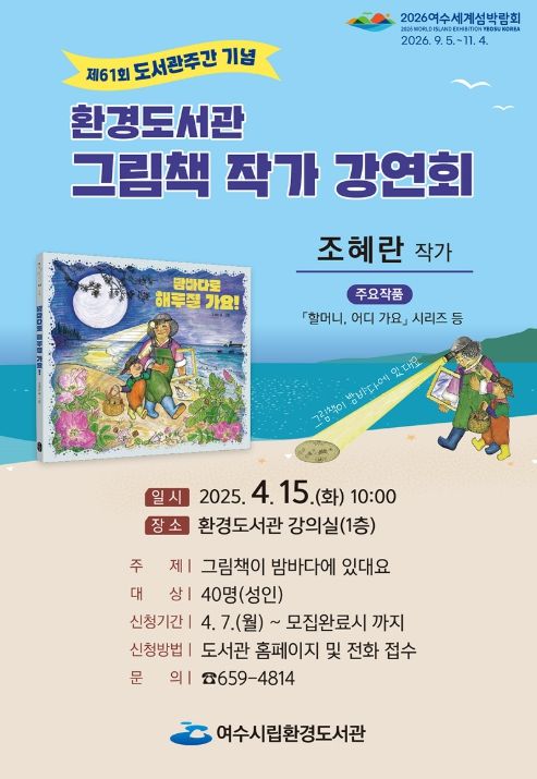 (정도일보) 여수시립환경도서관에서 제61회 도서관 주간(4월 12 부터 18일)을 맞아 마련한 ‘조혜란 그림책 작가 초청 강연회’ 참여자를 오는 7일부터 모집한다.
