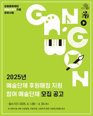 (정도일보) 강원문화재단은 예술단체의 안정적인 창작 기반 마련과 기업의 사회공헌 참여 활성화를 위해'2025년 예술단체 후원매칭 지원사업'을 추진한다.