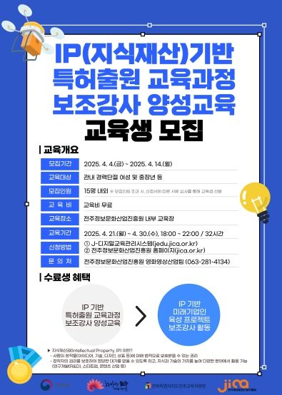 ‘IP(지식재산)기반 특허출원 교육과정 보조강사 양성교육’은 오는 21일부터 30일까지 전주정보문화산업진흥원 내부 교육장에서 진행되며, 총 32시간(8일 과정)으로 운영된다. 교육은 평일 오후 6시부터 10시까지 진행되며, 15명 내외의 교육생을 모집한다.