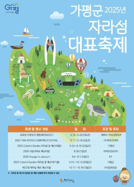 선정된 대표축제는 △글로벌 아웃도어 캠핑페어(4월 18~20일) △코베아 캠핑 페스티벌(5월 17~18일) △2025 Colorful Garden 자라섬 꽃 페스타(5월 24일~6월 15일, 9월 13일~10월 12일) △2025 이슬라이브 페스티벌(8월 30일) △2025 Voyage to Jarasum(9월 6~7일) △제22회 자라섬 재즈 페스티벌(10월 17~19일) 등이다. 이 중 가평군이 주관하는 축제는 자라섬 꽃 페스타 1건이며, 나머지 5건은 민간 주관 행사이다.