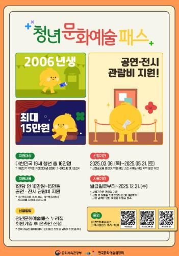 신청은 오는 5월 31일까지 청년 문화예술패스 누리집을 통해 소득과 관계없이 올해 19세가 되는 2006년생 청년이라면 누구나 신청할 수 있다.