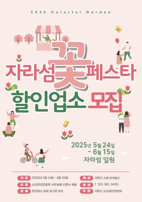 (정도일보) 가평군과 가평군소상공인연합회는 5월 24일부터 6월 15일까지 열리는 ‘2025 자라섬 꽃 페스타(봄)’ 기간에 관광객 대상 음식점 할인이벤트에 참여할 업소를 4월 25일까지 모집한다.