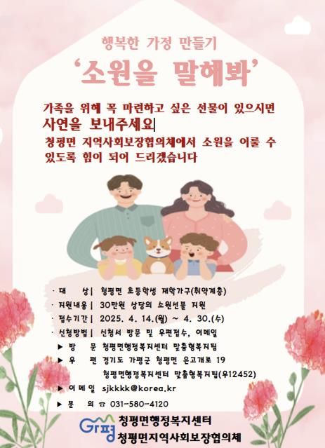 (정도일보) 가평군 청평면지역사회보장협의체(지사협)는 가정의 달을 맞아 저소득층 아동을 위한 특화사업 ‘소원을 말해봐’를 추진한다고 18일 밝혔다.
