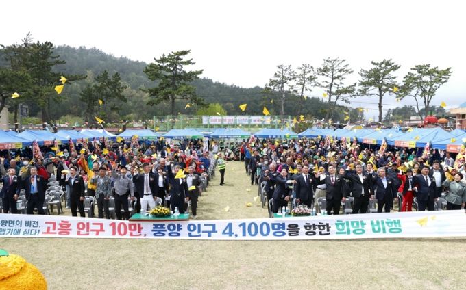 이날 면민들은 ‘고흥 인구 10만, 풍양 인구 4,100명을 향한 희망 비행’이라는 염원을 담아, 유자와 세월호의 상징색인 노랑 종이비행기를 날리는 화합 퍼포먼스를 펼쳐 눈길을 끌었다.
