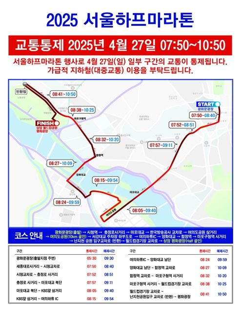 (정도일보) 서울시가 4월 27일 오전 8시부터 광화문광장을 출발해 여의도공원과 상암 평화광장으로 향하는 ‘2025 서울하프마라톤대회’를 개최한다.