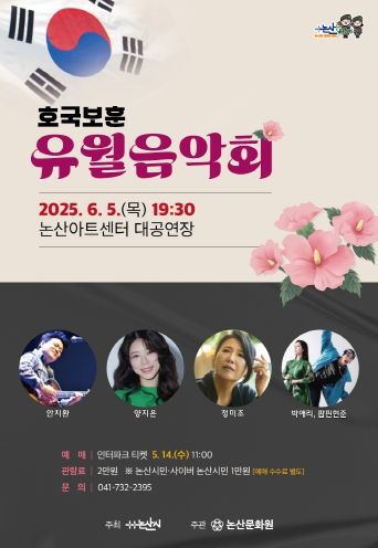 (정도일보) 논산문화원은 6월 5일 저녁 7시 30분 논산아트센터에서 호국보훈 ‘유월음악회’를 개최한다. 논산시립합창단과 가수 정미조, 박애리와 팝핀현준, 팝핀현준크루, 안치환, 양지은 등이 출연하여 100분 동안 감동과 즐거움 선사한다.