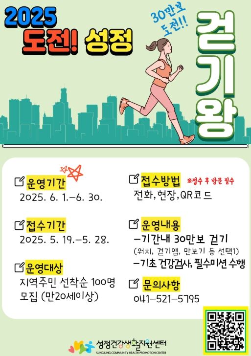 (정도일보) 천안시 서북구보건소 성정건강생활지원센터는 오는 6월 한 달간 ‘2025 도전! 성정 걷기왕’을 운영한다고 15일 밝혔다.