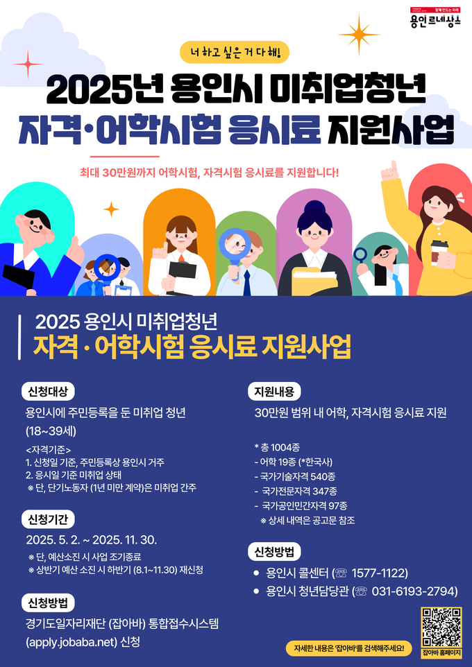 대상은 용인시에 거주하는 18~39세 청년(1985년생~2007년생)이며, 응시 횟수 제한 없이 1인당 30만원까지 응시료 실비를 지원한다.