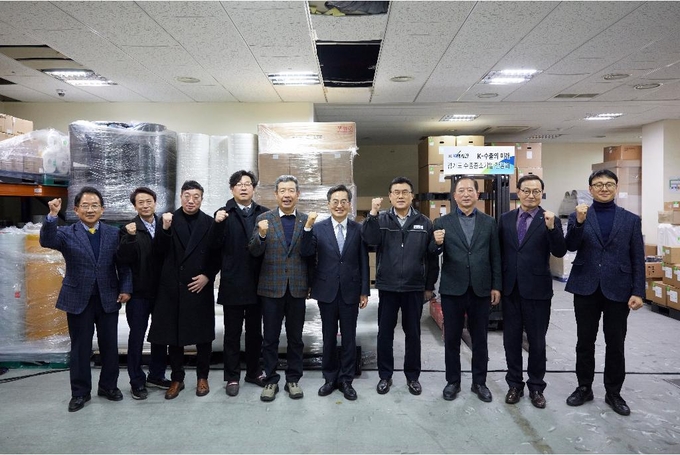 지난 2월 20일 오후 ㈜예선테크에서 열린 경기도 수출 중소기업 현장 간담회에서 김동연 경기도지사와 도내 수출 중소 유망기업 대표 등과 함께 기념촬영을 하고 있다 [사진=경기도]