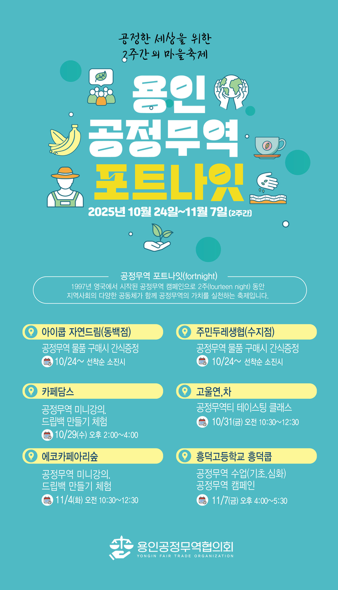 행사는 10월 24일 아이쿱 자연드림(동백점)과 주민두레생협(수지점)의 간식 증정 행사(10월 24일)를 시작으로, 10월 29일 카페 담스에서 공정무역 미니강의와 드립백 만들기 체험, 10월 31일 고울연, 차에서 차 시음 수업, 11월 4일 에코카페 아리숲에서 공정무역 강의와 체험프로그램이 진행된다.