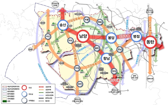 생활권은 동탄, 동부, 중부, 서부 총 4개 권역으로 계획했으며 ▲동탄생활권은 신산업 생태계 구축 및 친환경 생태도시 기반 마련 ▲동부생활권은 광역환승거점 조성을 통한 원도심 정비 및 관광산업 육성 ▲중부생활권은 산·학·연 연계 네트워크 조성 및 녹색관광벨트 구축 ▲서부생활권은 자동차·바이오 등 신성장산업 연계 클러스터 구축과 해양 관광산업 육성을 발전전략으로 제시했다.