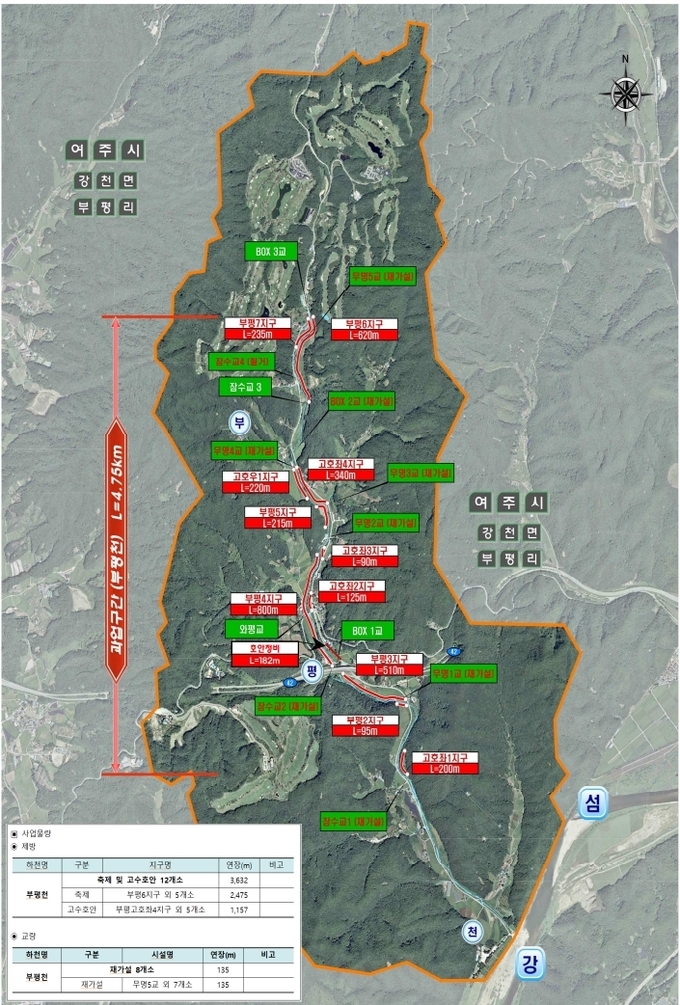 정비사업은 총 연장 4.75km 구간의 하천을 정비하는 것으로 ▲축제공(제방 쌓기) 3.4km ▲교량 8개 설치 등이 포함된다.