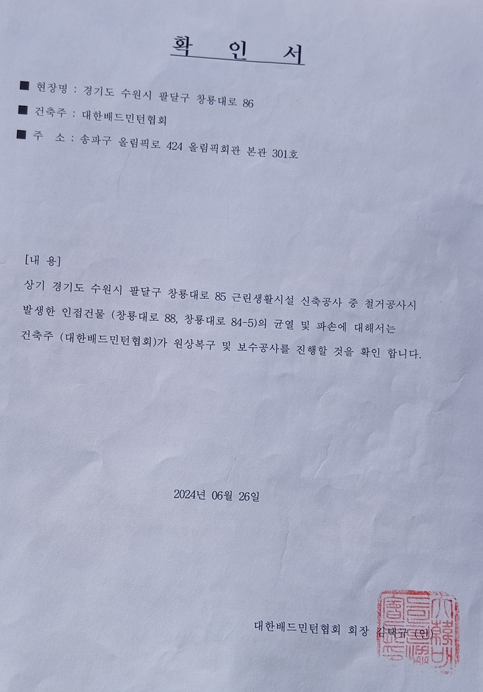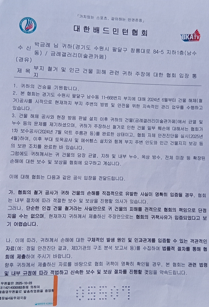 [정도일보 김현섭 기자] 대한배드민턴협회(회장 김동문)가 경기도 수원시 남수동 소재 협회 건물의 철거 과정에서 인접 옆 건물에 외벽 붕괴 위험, 내부 누수 등의 피해를 주고도 1년 넘게 피해 보상을 미루어오다가 이를 지속적으로 항의하는 피해자에게 뒤늦게 내용 증명을 보내는 등 갑질을 하고 있어 물의를 빚고 있다.