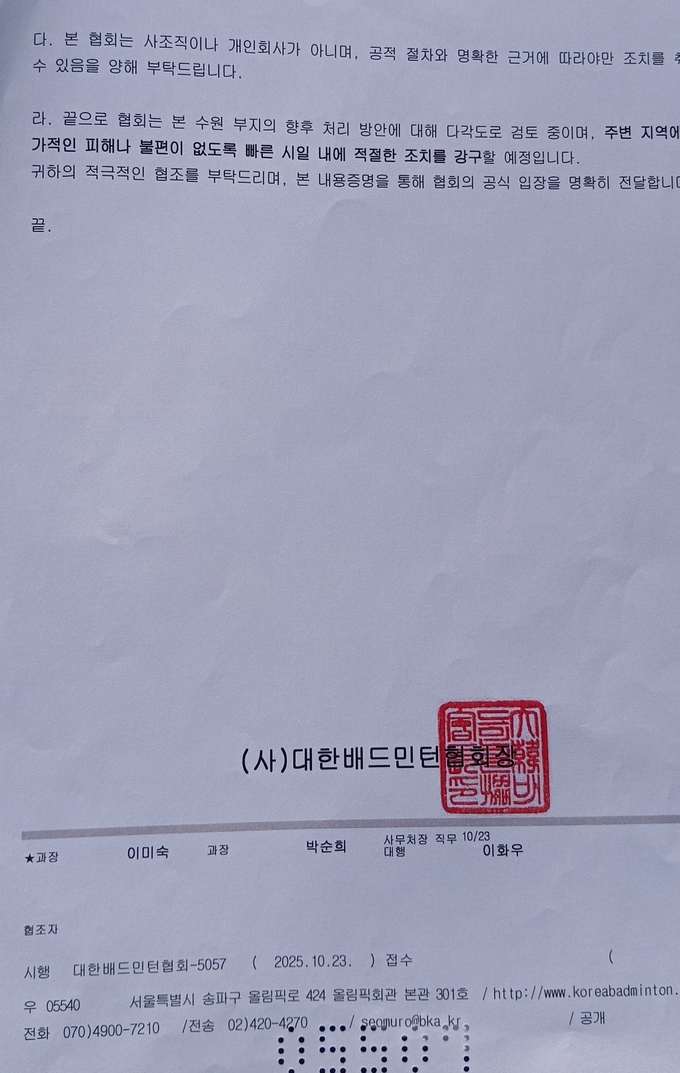 마지막으로 피해자 A씨는 "앞으로 얼마가 들어갈 지 모를 피해를 입혀 놓고 실질적 피해 보상은 논하지 않고 물받이통 등 몇 만원짜리 물품을 교체해 놓고는 피해보상을 해주었다고 하는 것은 인간적으로나 사회적으로도 옳지 못한 행위"라며 "1년 넘게 피해 복구 업자 선정 중이라는 등 이리저리 피해 복구를 질질끌더니 결국 내용증명이나 보내는 이런 배드민턴협회의 일처리 방식은 사회적으로나 도덕적으로 몰매를 맞아도 할 말이 없을 것"이라고 말했다.