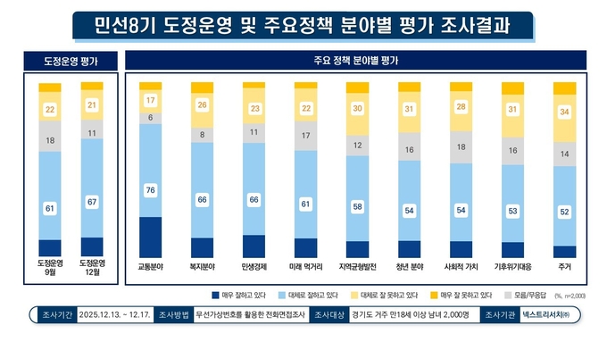 경기도가 여론조사 전문기관 넥스트리서치에 의뢰해 12월 실시한 여론조사 결과, 경기도정 운영을 ‘잘하고 있다’는 응답은 67%로 집계됐다. 이는 동일한 조사 설계로 실시한 9월 61%보다 6%p 상승한 수치다. 반면, 도정 운영을 ‘잘 못하고 있다’는 응답은 21%로 9월 22% 대비 1%p 하락했다.