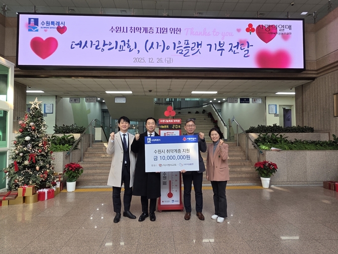 수원시청에서 열린 기부금 전달식에는 임대호 더사랑의교회 목사, 김인배 시민복지국장 등이 참석했다.