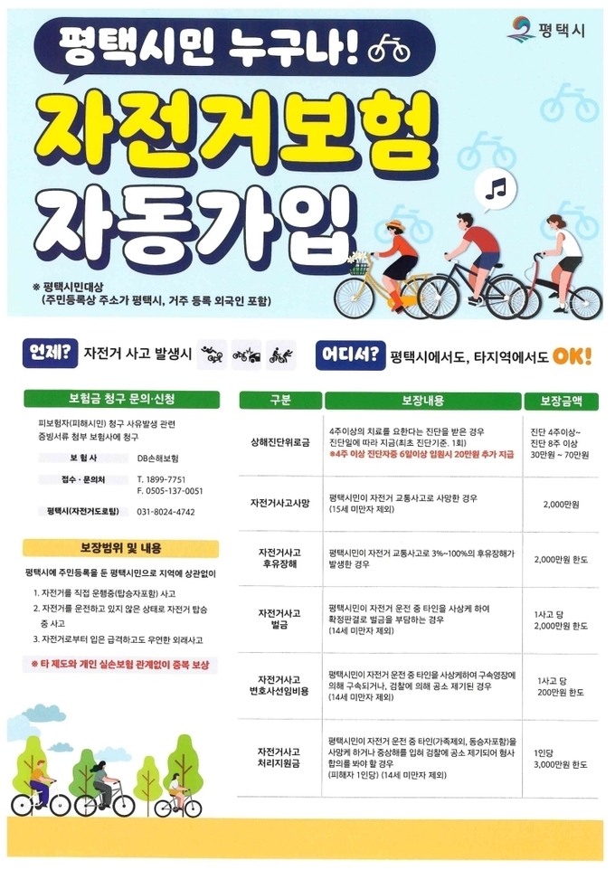 평택시 자전거 보험은 평택시에 주민등록이 되어 있는 시민이라면 별도의 가입 절차 없이 자동으로 가입되며, 자전거 사고로 인한 사망·후유장해, 진단위로금, 벌금, 변호사 선임 비용 등을 보장한다.