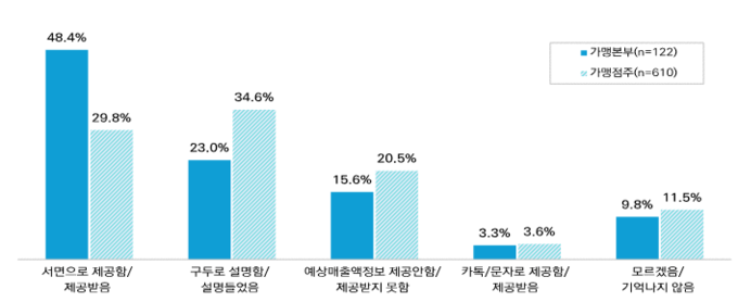 가맹본부의 76.2%는 정보공개서 변경 등록·신고 의무를 위반할 경우 과태료가 부과된다는 사실을 인지하고 있었으나, 예상매출액 및 그 산정서에 관한 서면 교부·보관 의무 위반이 과태료 부과 대상임을 알고 있는 가맹본부는 약 40%에 그쳤다.