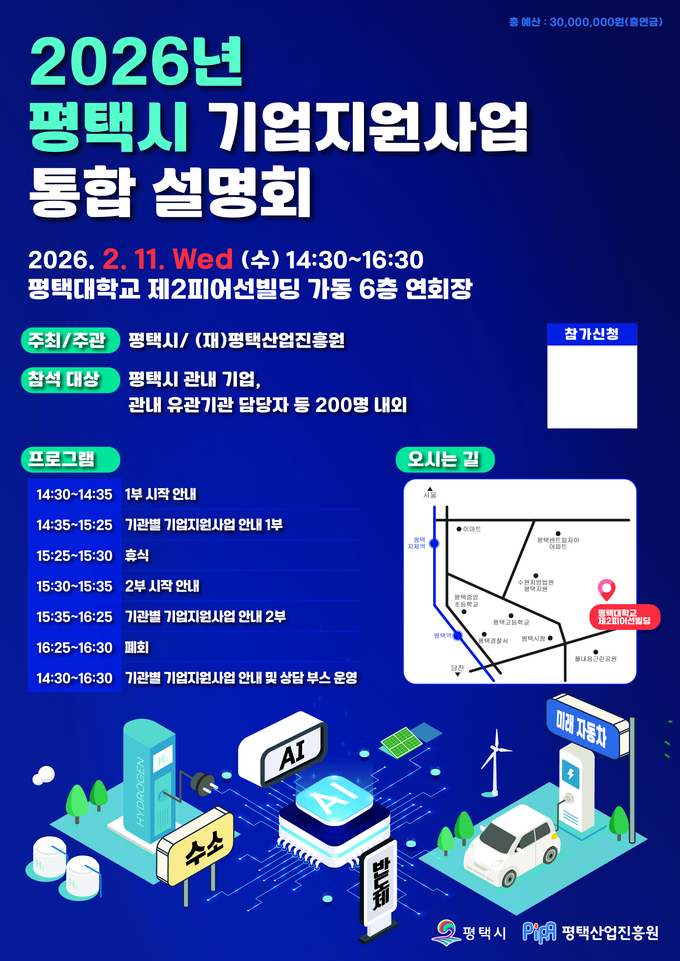 [정도일보 김제영 기자] 평택시가 평택산업진흥원과 함께 오는 2월 11일(수) 평택대학교 제2피어선빌딩 6층 대강당에서 ‘평택 중소기업 지원사업 설명회’(이하 지원사업 설명회)를 개최한다.