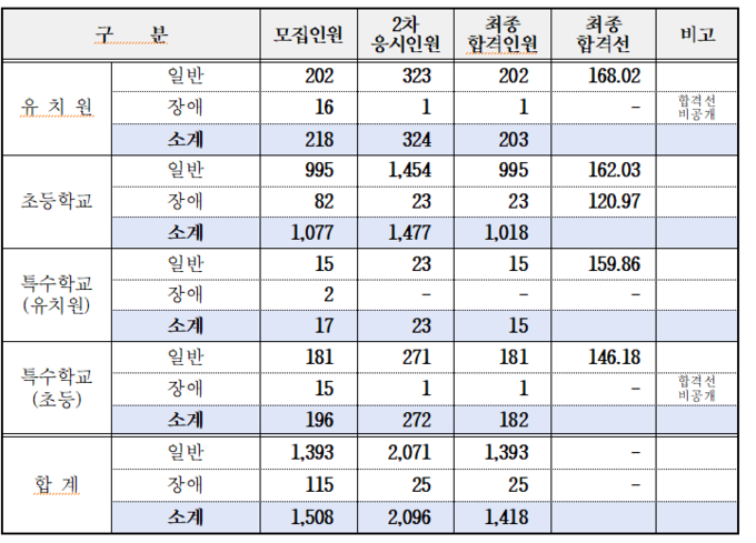 도교육청은 분야별 지원자 총 5,195명 중 ▲공립 1,418명, ▲국립 3명을 최종합격자로 선정했다. 지난해 11월 시행한 1차 시험과 올해 1월 시행한 2차 시험을 거친 결과다.
