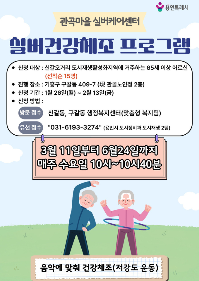 [정도일보 김제영 기자] 용인특례시는 ‘관곡마을 실버케어센터 실버건강 프로그램’ 참가자를 13일까지 모집한다.