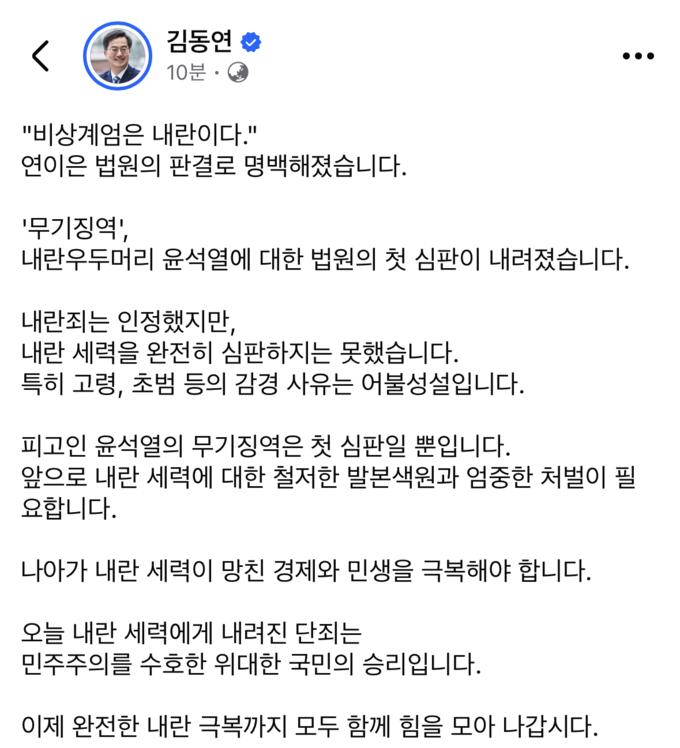 그러면서 "내란 세력이 망친 경제와 민생을 극복해야 한다. 오늘 내란 세력에게 내려진 단죄는 민주주의를 수호한 위대한 국민의 승리"라며 "이제 완전한 내란 극복까지 모두 함께 힘을 모아 나가자"고 말했다.