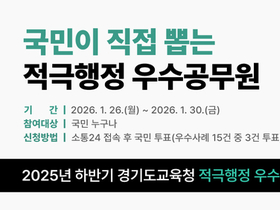 [정도일보 김제영 기자] 경기도교육청이 공공의 이익을 높인 적극행정 우수공무원 선정을 위해 2025년도 하반기 대국민 심사를 실시한다. 도교육청은 창의적이고 능동적인 행정을 펼친 각 기관의 추천 사례를 접수해 1차 예선심사에서 우수사례 15건을 선정했다. 이를 대상으로 1월 26일(월)부터 30일(금)까지 ‘소통24’ 누리집(sotong.go.kr)에서 국민이 참여하는 온라인 투표 방식의 대국민 심사를 진행한다. 참여자는 1인당 3건의 우수사례에 투표할 수 있다. 본선 진출자는 예선심사 점수 60%와 국민투표 결과 40%를 합산해 최종 결정된다. 선발된 공무원에게는 교육감 표창과 포상금, 특별승급의 인사상 가점부여 등 다양한 특전을 제공할 계획이다. 이번 선발은 단순한 성과 평가를 넘어 적극행정의 모범사례를 널리 알리고, 공직사회 전반에 적극행정 문화를 확산시키는 의미가 있다. 특히 국민이 직접 우수공무원을 선정함으로써 정책 수요자의 관점이 반영된다는 점에서 공정하고 투명한 심사 절차가 마련될 것으로 기대된다. 도교육청은 앞으로도 국민이 체감하는 변화를 만들어낸 공무원의 노력을 널리 알리고, 적극행정을 일상적 공직문화로 조성하기 위해 지속적으로 노력할 방침이