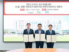 [정도일보 정근영 기자] 포천시는 10일 소흘읍 이동교리와 영중면 양문일반산업단지 일대에서 도시가스 미공급지역의 에너지 복지 확대를 위한 연료전지 발전사업을 추진한다고 밝혔다. 이날 시청 시정회의실에서 열린 협약식에는 백영현 포천시장, 김형일 한국수력원자력 에너지믹스사업본부장, 전동수 대륜이엔에스 대표이사가 참석해 '포천시(소흘·양문) 연료전지 발전사업 양해각서(MOU)'를 체결했다. 협약에 따라 포천시는 사업 추진을 위한 행정 지원을 맡고, 한국수력원자력은 소흘읍 이동교리에 9.9메가와트(MW), 영중면 양문일반산업단지에 4.95메가와트(MW) 규모의 연료전지 발전소를 건설한다. 대륜이엔에스는 연료 공급을 담당하며 발전소 인근 도시가스 미공급지역에 도시가스 공급을 확대할 계획이다. 포천시는 이번 연료전지 발전사업을 통해 소흘읍 이동교1·2리와 초가팔1리 약 100세대, 영중면 양문리 약 600세대가 도시가스 공급 혜택을 받을 것으로 기대된다. 백영현 포천시장은 "이번 양해각서 체결은 친환경 에너지 전환과 도시가스 미공급 지역의 공급 확대를 통해 시민 에너지 복지를 실현하는 중요한 첫걸음"이라며 "특히 영중면 지역의 도시가스 공급은 미군 영평사격장으로 피해를