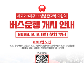 [정도일보 김제영 기자] 오산시는 세교1·2지구에서 성남 야탑역까지 운행하는 직행좌석형 버스 8303번이 오는 2월 2일 오전 6시 30분 첫차부터 정식 운행을 시작한다고 밝혔다. 개통식은 1월 30일 진행될 예정이다. 이번에 신설되는 8303번 버스는 하루 2대가 투입돼 총 8회 운행된다. 세교1·2지구를 비롯한 오산 주민들의 수도권 남부 이동 편의를 크게 높일 것으로 기대된다. 특히 성남 판교·야탑 방면 직행 노선에 대한 시민들의 지속적인 요구를 반영해 마련된 노선이라는 점에서 의미가 크다. 8303번 버스는 세교2지구 한신더휴를 기점으로 ▲오산초 ▲세교2지구 7단지 ▲호반써밋라포레를 거쳐, 세교1지구 구간인 ▲세교고인돌공원 ▲죽미마을 입구 ▲세마중고 ▲세마역을 경유한다. 이후 성남으로 이동해 판교역과 야탑역을 차례로 정차한다. 오산시는 세교1·2지구 인구 증가와 함께 판교·야탑 등 수도권 남부 주요 업무지구로의 출퇴근 수요가 꾸준히 늘어남에 따라 직행 노선 확충의 필요성을 검토해 왔다. 이번 8303번 버스 운행으로 기존 환승 위주의 이동 부담이 줄고, 이동 시간 단축 효과도 기대하고 있다. 한편 오산시는 지난해 7월에도 성남 야탑행 광역버스 8301번