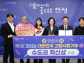 [정도일보 김선자 기자] 안성시는 지난 9일, 한국프레스센터에서 열린 '제1회 2026 고향사랑기부제 어워드'에서 ‘수도권 혁신상’을 수상했다. 이번 어워드는 한국지방자치학회와 시사저널이 공동 주최했으며, 고향사랑기부제의 성과 확산과 우수사례 공유를 목적으로 처음 개최됐다. 전국 지방자치단체를 대상으로 제도 운영 전반과 모금·기금 활용 사례 등을 종합 평가해 우수 지자체를 선정했다. 시는 수도권 혁신상 수상 지자체로 선정되며, 고향사랑기부제의 안정적인 운영과 지역 특성을 반영한 제도 추진 성과를 인정받았다. 특히 수도권 지자체로서 제도의 취지에 부합하는 다양한 운영 사례를 만들어 왔다는 점에서 의미 있는 성과로 평가받았다. 앞서 안성시는 농림축산식품부 주관 고향사랑기부제 우수사례 장관상과 SBS 고향사랑기부 대상을 수상한 바 있으며, 이번 수상을 통해 제도 운영 분야에서의 지속적인 성과를 이어가고 있다. 시 관계자는 “이번 수상은 고향사랑기부제 도입 이후 제도 정착과 활성화를 위해 꾸준히 노력해 온 결과”라며 “앞으로도 지역 실정에 맞는 기금사업 발굴과 참여 확대를 통해 고향사랑기부제가 지역과 기부자를 연결하는 제도로 자리 잡을 수 있도록 최선을 다하겠다”고
