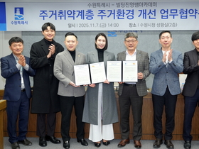 [정도일보 고정희 기자] 수원특례시(시장 이재준)와 빌딩진영쌤아카데미는 7일 시청 상황실에서 업무협약을 체결하고, 주거취약계층의 주거 환경 개선을 위해 협력하기로 했다. 두 기관은 기초생활보장수급자‧다자녀 가구 등 주거취약계층에 도배, 장판 교체, 싱크대 설치, 전기 점검 등 주거 환경 개선 서비스를 제공하고, 생활에 필요한 물품을 지원하기로 했다. 빌딩진영쌤아카데미는 부동산 분야 무료 컨설팅, 아동양육시설 자원봉사 등 재능 기부 활동도 협력하기로 했다. 이날 협약식에는 김태관 수원시 도시개발국장과 빌딩진영쌤아카데미 김진영·서현옥 공동대표 등이 참석했다. 수원시 관계자는 “주거취약계층에게는 주거 공간뿐 아니라 지속가능한 주거복지 서비스가 필요하다”며 “이번 협약으로 주거취약계층이 주거 환경을 개선하고, 삶의 질을 높일 수 있도록 지원할 것”이라고 밝혔다. 이어 “빌딩진영쌤아카데미와 협력해 집수리 지원 등 주거취약계층을 위한 다양한 사회 공헌 활동을 추진하겠다”고 말했다.