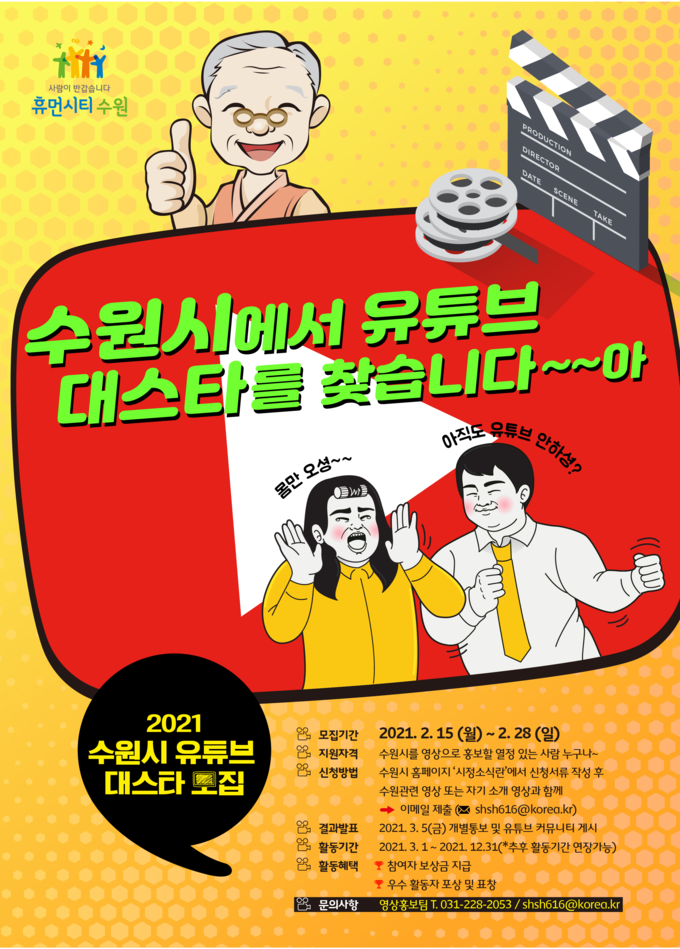 자세한 사항은 수원시청 홍보기획관 영상홍보팀 (031-228-2053)으로 문의하면 된다.