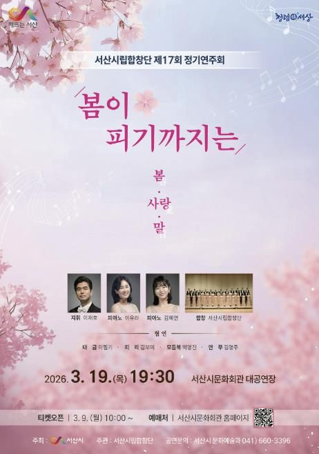 (정도일보) 충남 서산시는 오는 3월 19일 오후 7시 30분 문화회관 대공연장에서 서산시립합창단 제17회 정기연주회 ‘봄이 피기까지는’이 개최된다고 밝혔다.