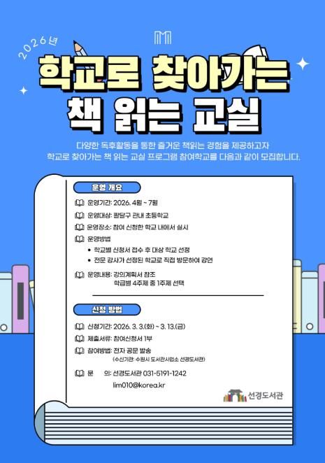 (정도일보) 수원시 선경도서관은 ‘2026년 학교로 찾아가는 책 읽는 교실’에 참여할 팔달구 관내 초등학교를 13일까지 모집한다.
