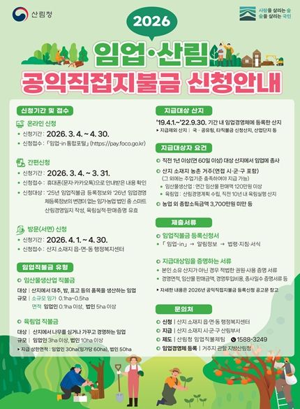 (정도일보) 강원특별자치도는 2026년 임업·산림 공익직접지불금 신청을 3월 4일부터 4월 30일까지 접수한다고 밝혔다.