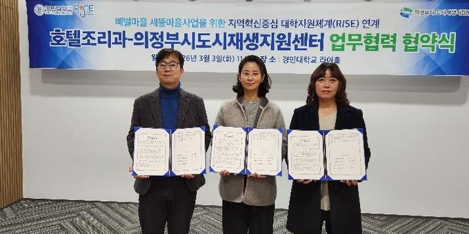(정도일보) 의정부시도시재생지원센터는 3월 3일 경민대학교 호텔조리과와 성공적인 빼벌새뜰마을사업을 위해 업무협약을 체결했다.