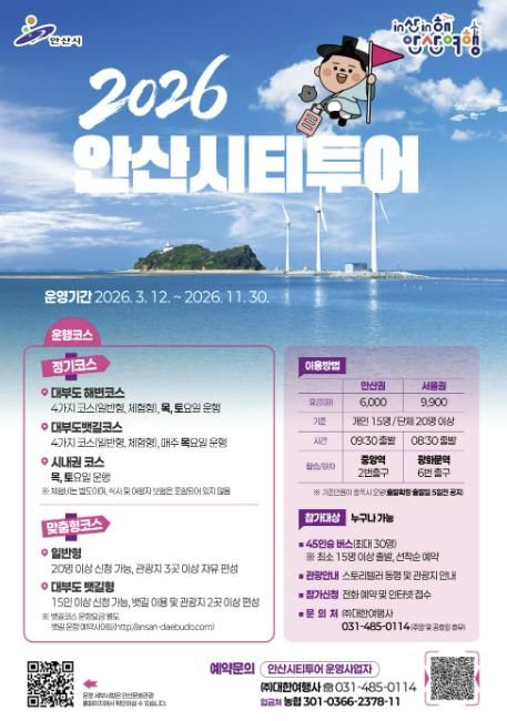 이민근 안산시장은 “2026 안산시티투어는 시화호 뱃길 개통과 함께 안산의 다양한 관광 자원을 연결하는 핵심 관광 콘텐츠가 될 것”이라며 “시민과 관광객 모두가 안산의 매력을 편안하게 즐길 수 있도록 관광 활성화에 힘쓰겠다”고 말했다.