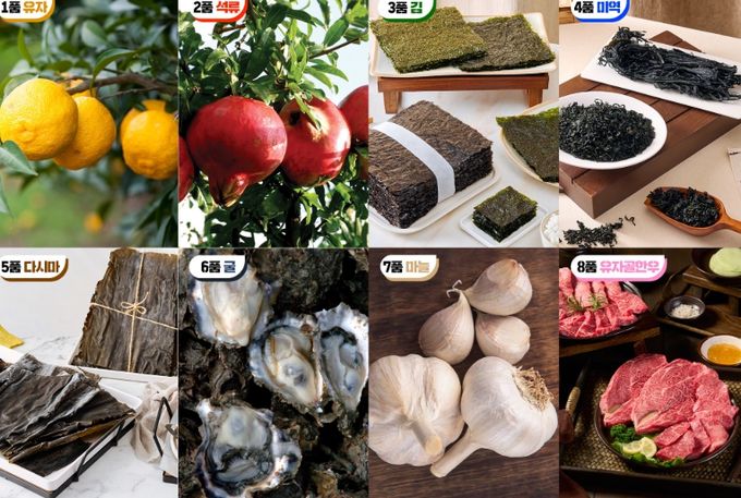 고흥군의 8품은 유자, 석류, 김, 미역, 다시마, 굴, 마늘, 유자골한우로, 청정 자연환경과 풍부한 해양자원을 기반으로, 전국적으로 품질을 인정받고 있다.