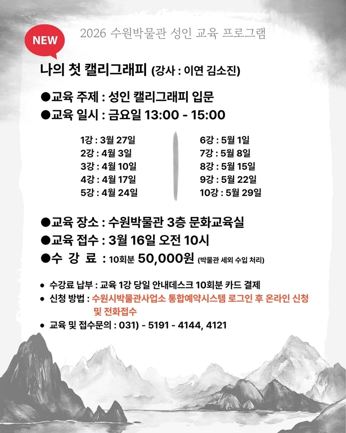 강의는 3월 25일부터 5월 29일까지 수원박물관 3층 문화교육실에서 2시간 동안 진행된다. 서예와 캘리그래피에 관심 있는 성인은 누구나 참여할 수 있다.