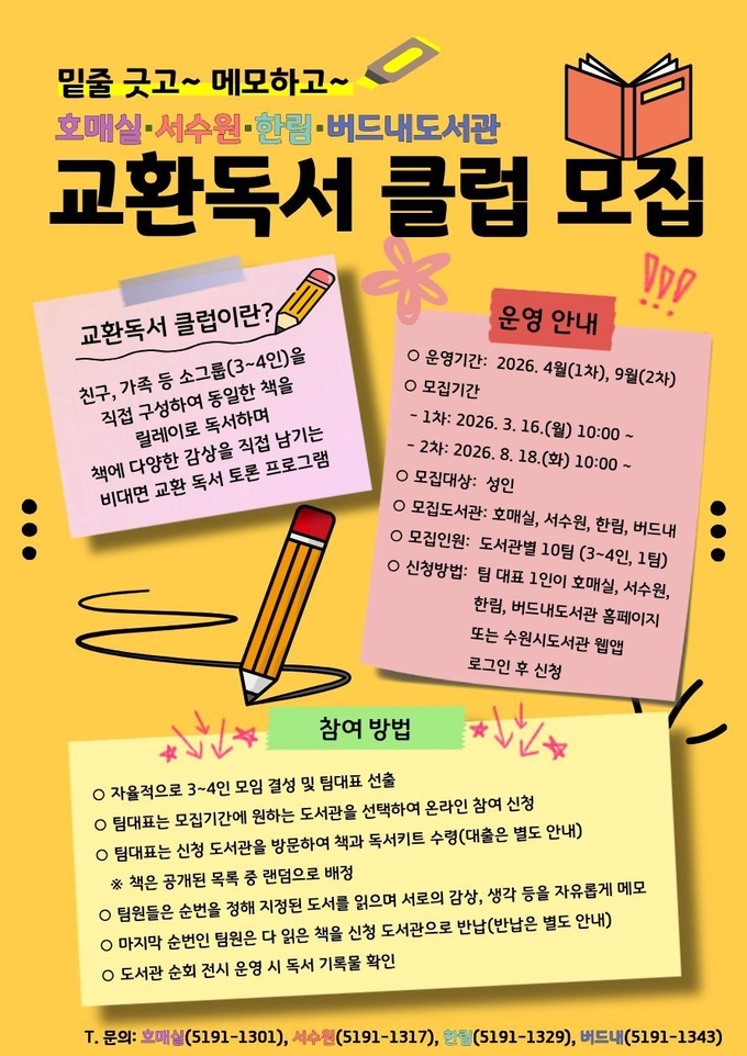호매실도서관 관계자는 “교환독서 클럽은 같은 책을 읽더라도 서로 다른 시선과 생각을 자연스럽게 나눌 수 있는 프로그램”이라며 “가족. 친구와 함께 특별한 독서 경험을 하길 원하는 시민들의 많은 관심과 참여를 바란다”고 말했다.